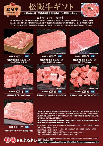 * GE-1 松阪牛すき焼き・しゃぶしゃぶ(ロース) 600g(木箱入り) * GE-2 松阪牛すき焼き・しゃぶしゃぶ(ロース・肩ロース) 850g * GE-3 松阪牛すき焼き・しゃぶしゃぶ(肩・モモ) 1200g * GE-4 松阪牛焼肉(肩ロース) 850g * GE-5 松阪牛サイコロステーキ(サーロイン) 600g * GE-6 松阪牛サイコロステーキ(ブレンド) 1000g * GE-7 松阪牛サーロインステーキ 3枚 600g(200g×3枚)